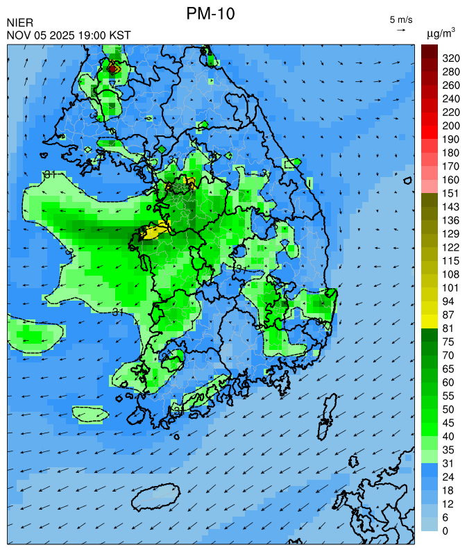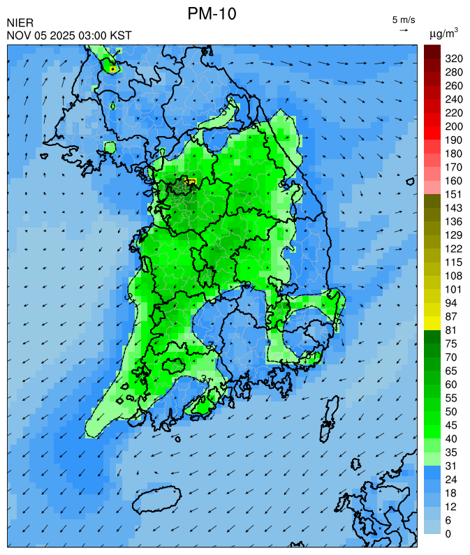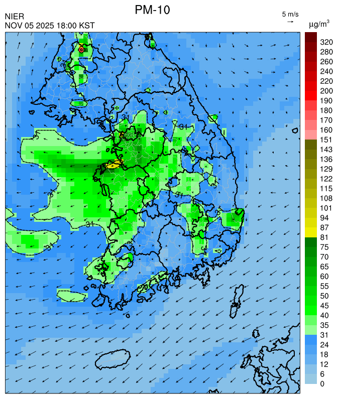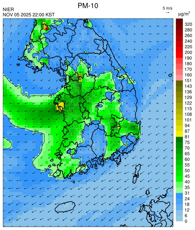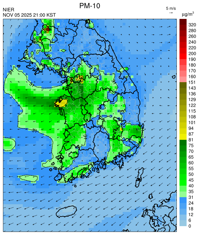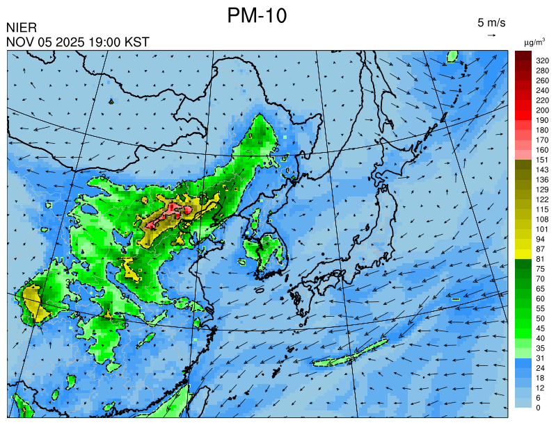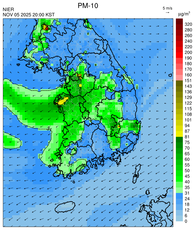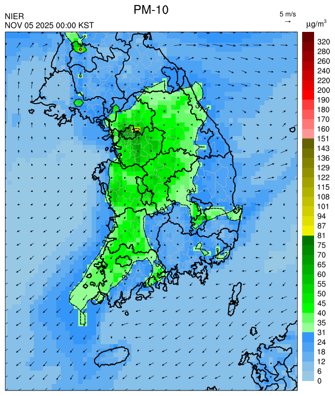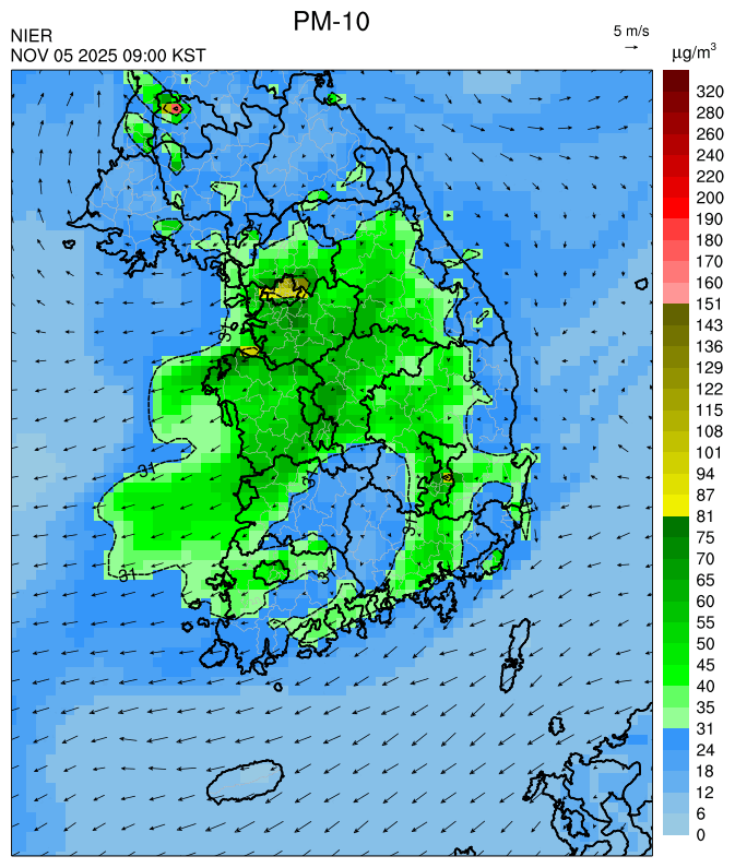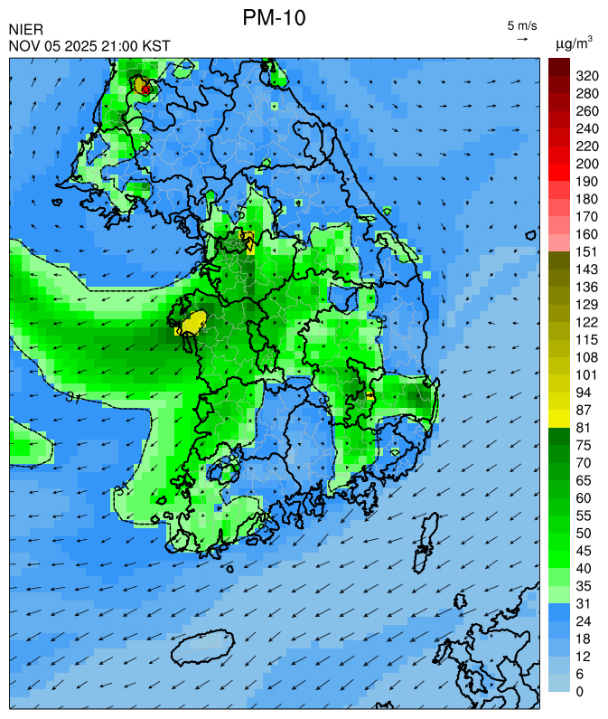 ○ [미세먼지] 대부분 중서부 지역은 대기 정체로 전일 잔류 미세먼지가 유지되는 가운데 밤에 연직(상·하층) 혼합이 약해 국내 발생 미세먼지가 축적되어 농도가 높을 것으로 예상됩니다.