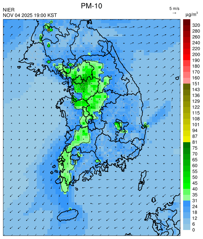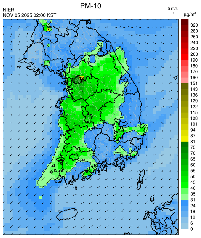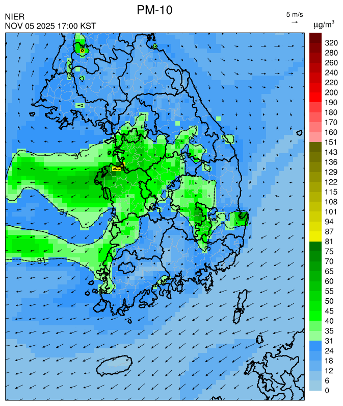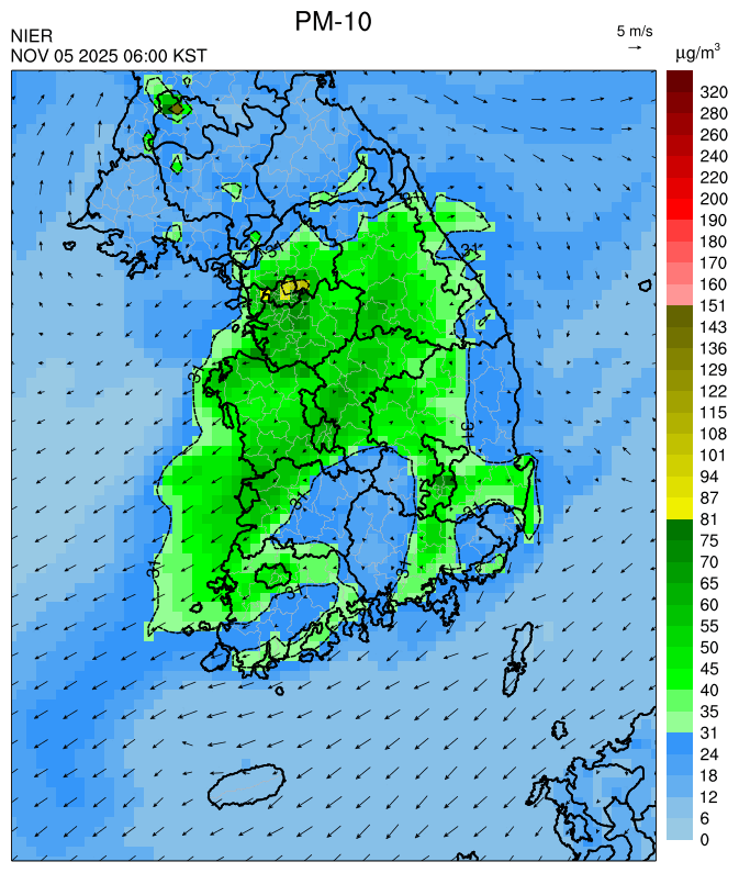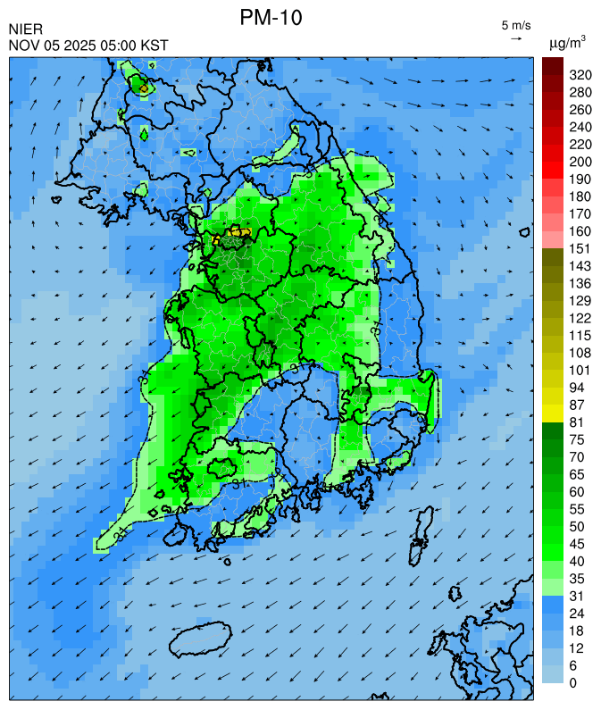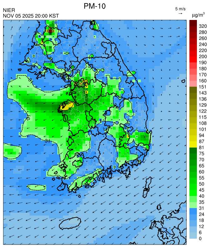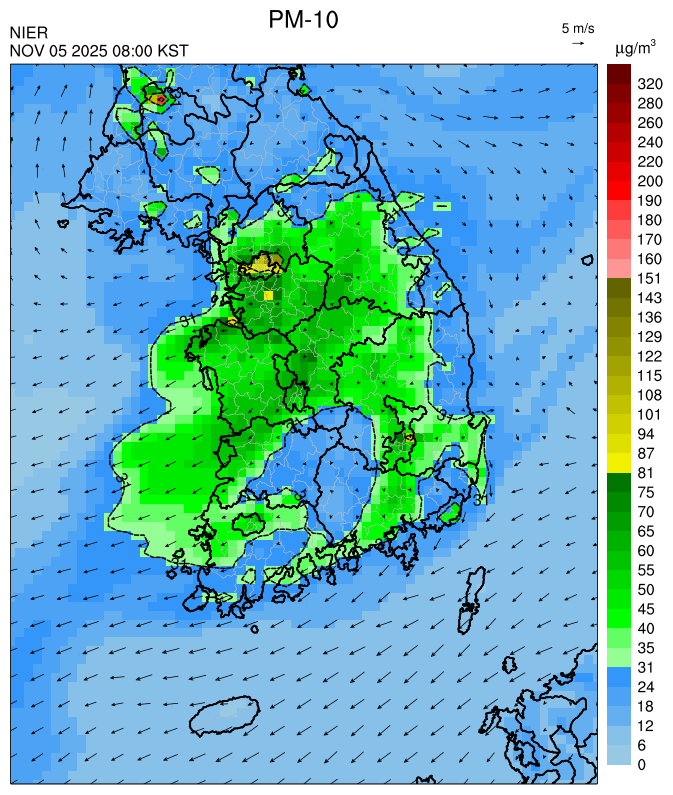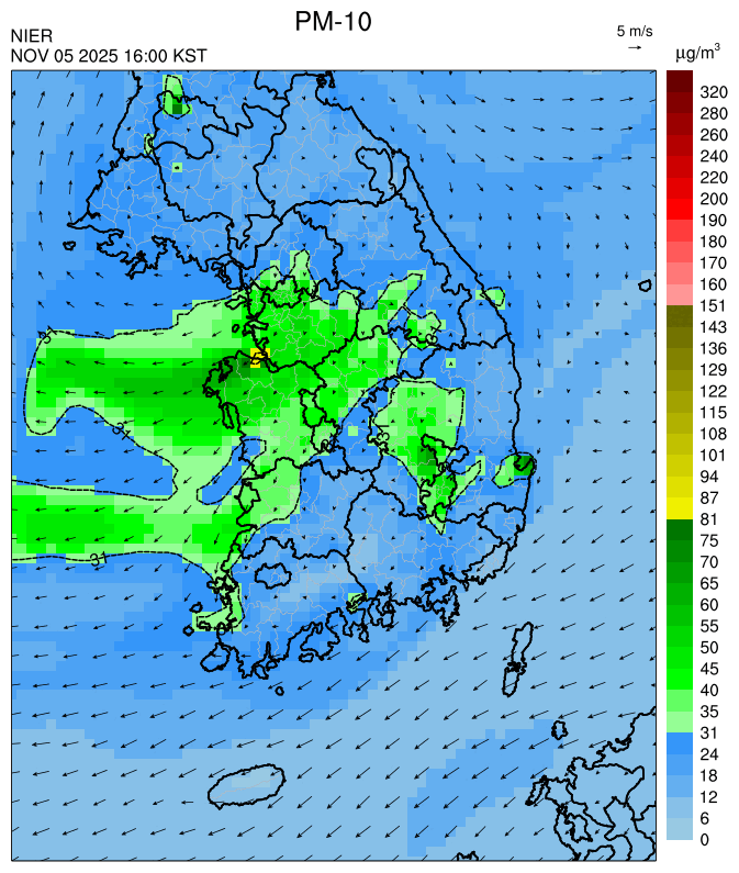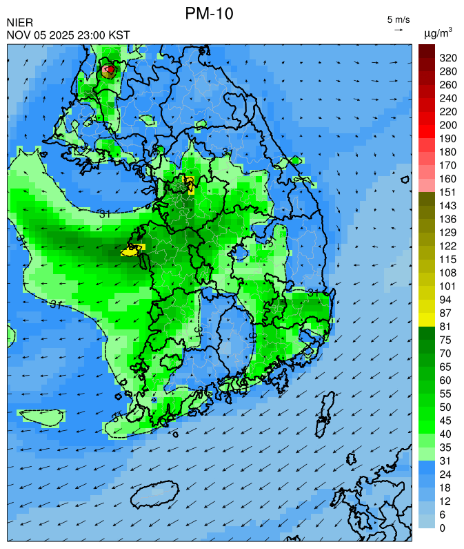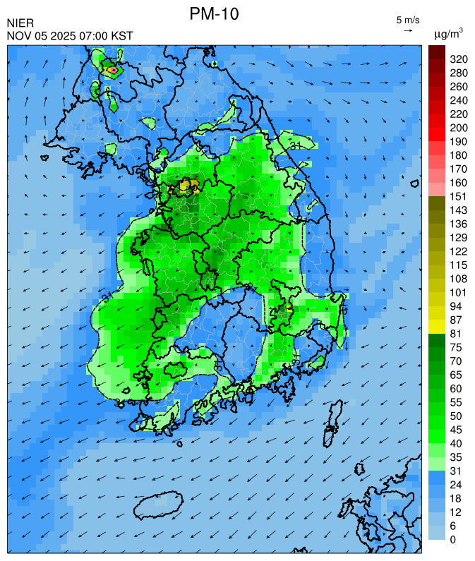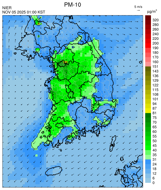 ○ [미세먼지] 대부분 중서부 지역은 대기 정체로 전일 잔류 미세먼지가 유지되는 가운데 밤에 연직(상·하층) 혼합이 약해 국내 발생 미세먼지가 축적되어 농도가 높을 것으로 예상됩니다.