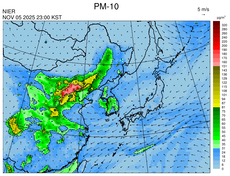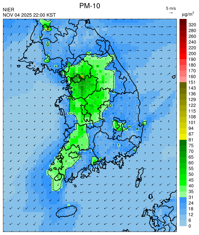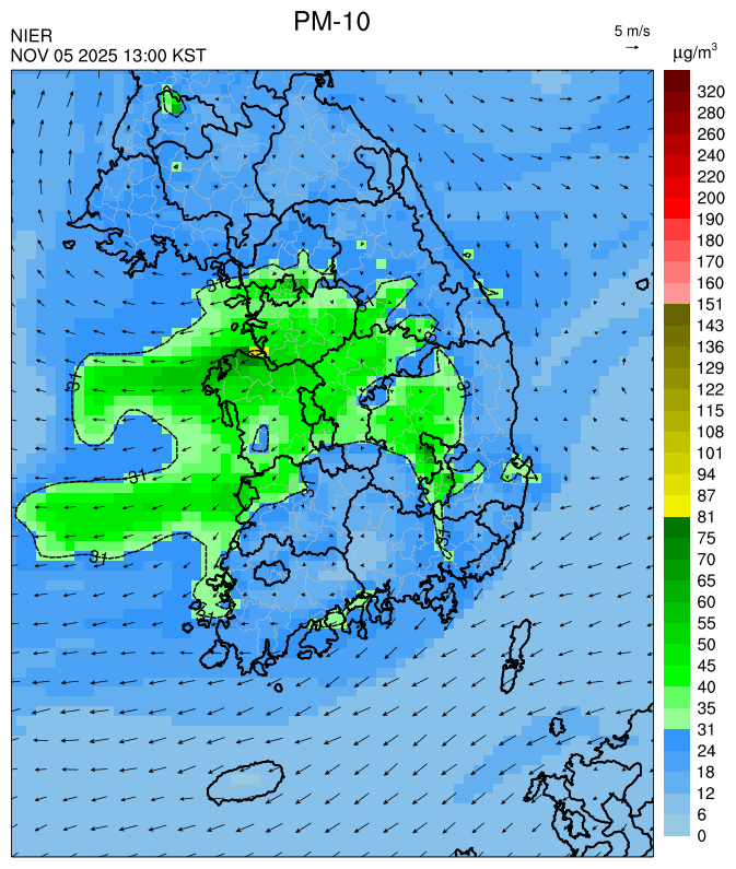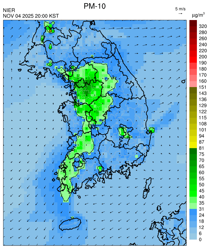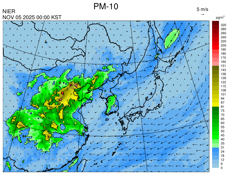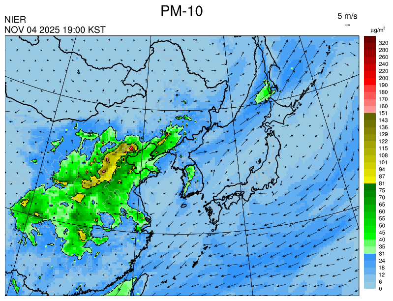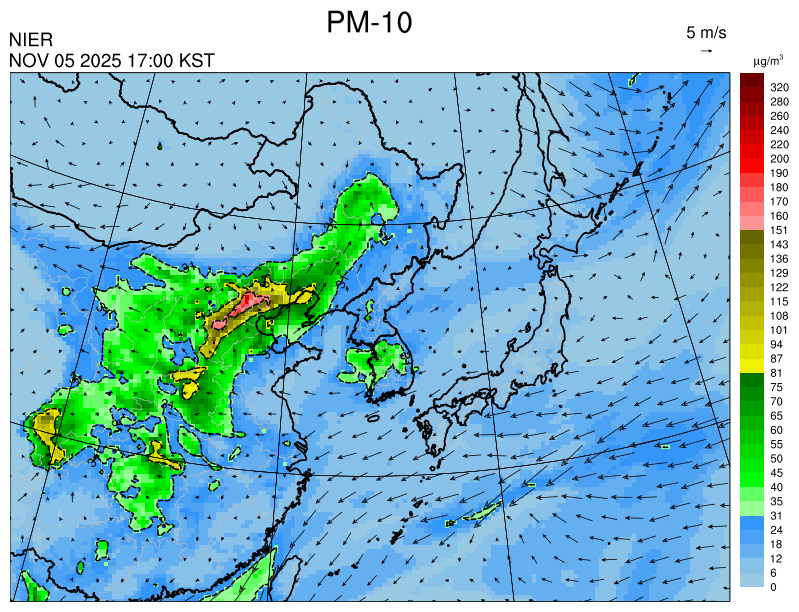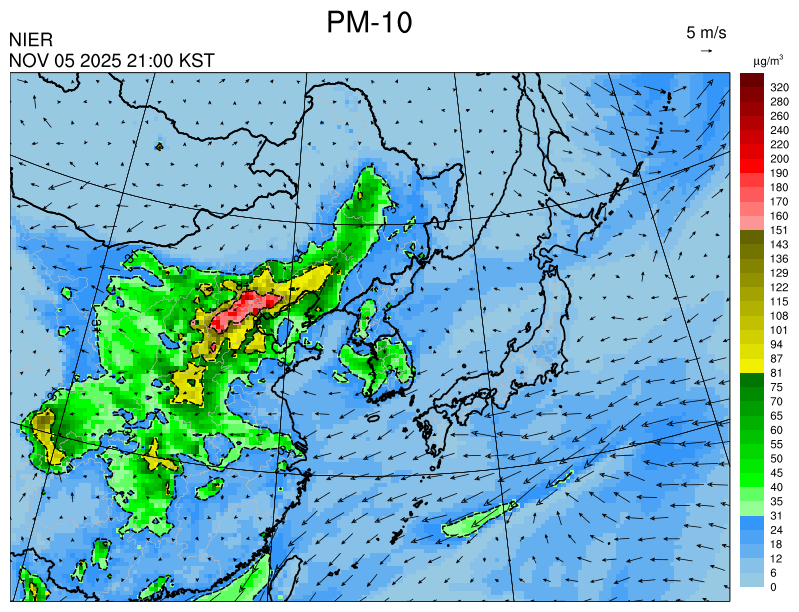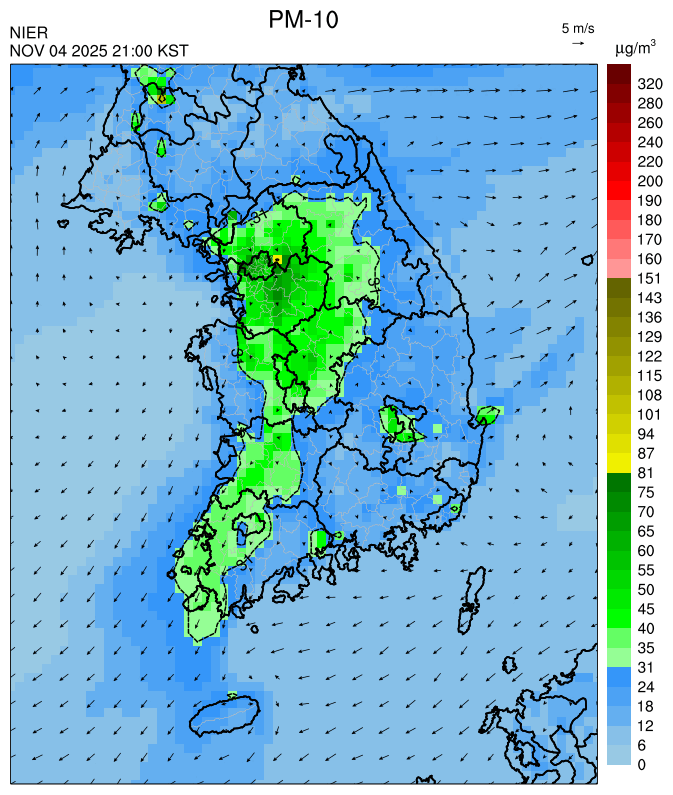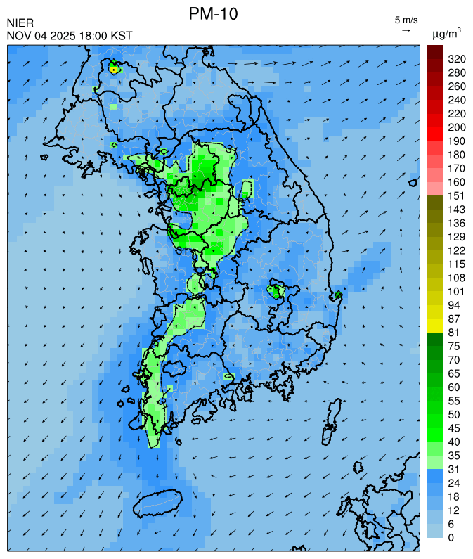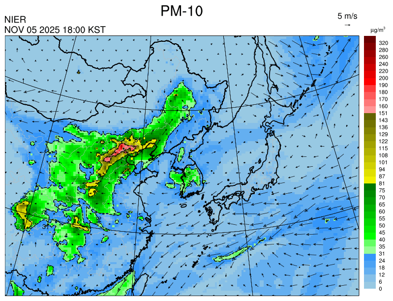 ○ [미세먼지] 대부분 중서부 지역은 대기 정체로 전일 잔류 미세먼지가 유지되는 가운데 밤에 연직(상·하층) 혼합이 약해 국내 발생 미세먼지가 축적되어 농도가 높을 것으로 예상됩니다.