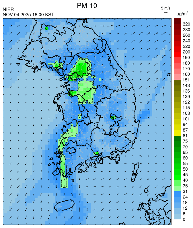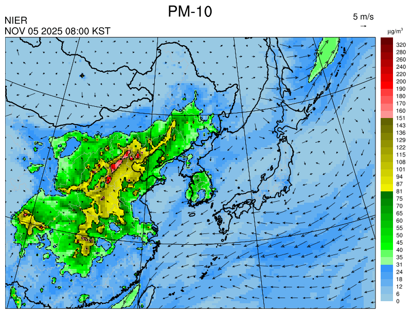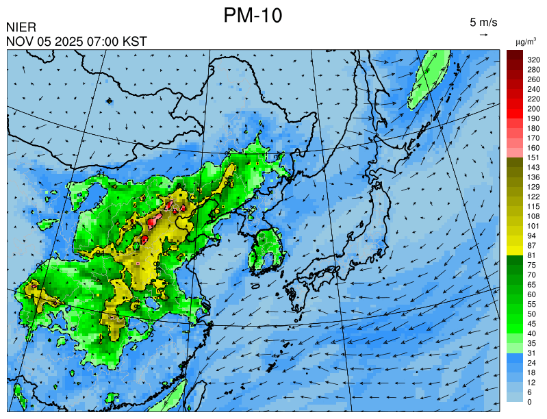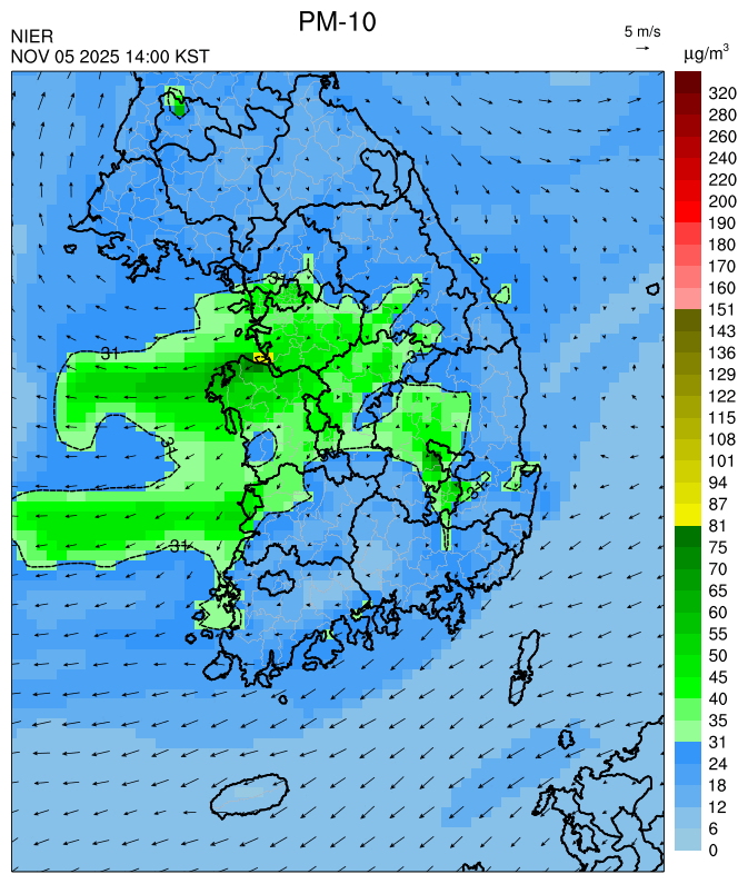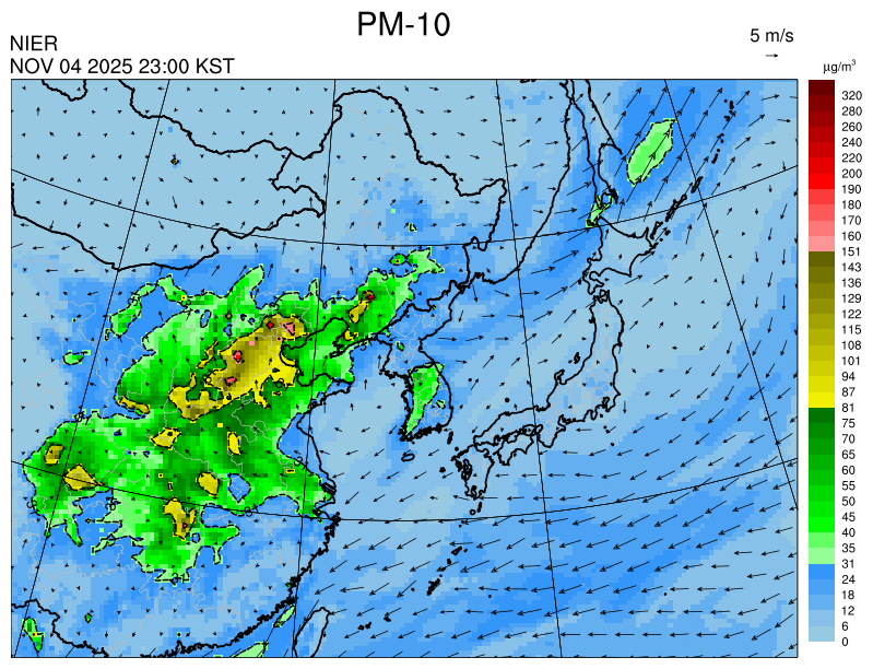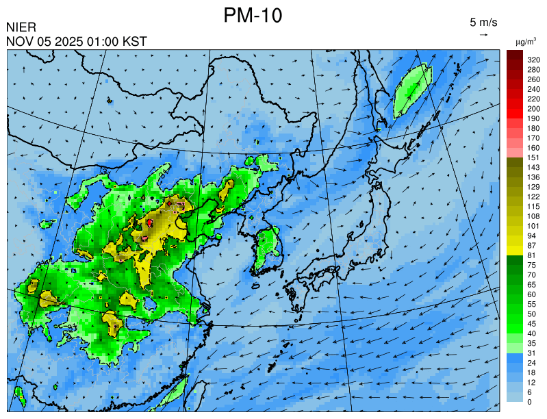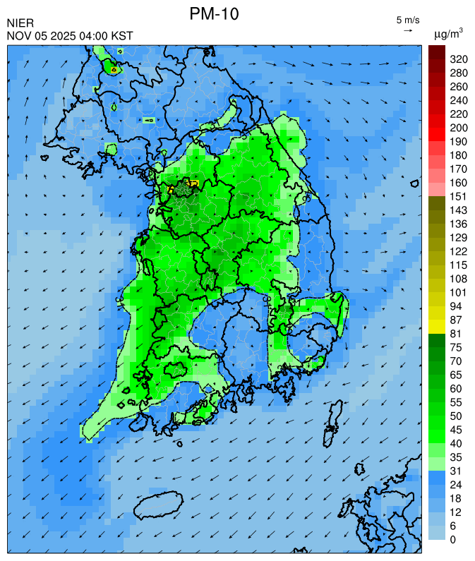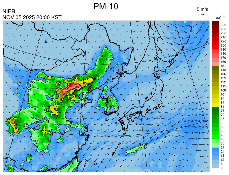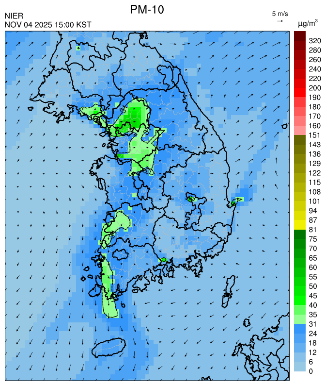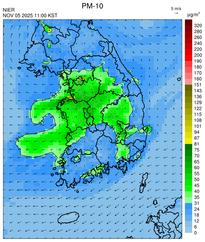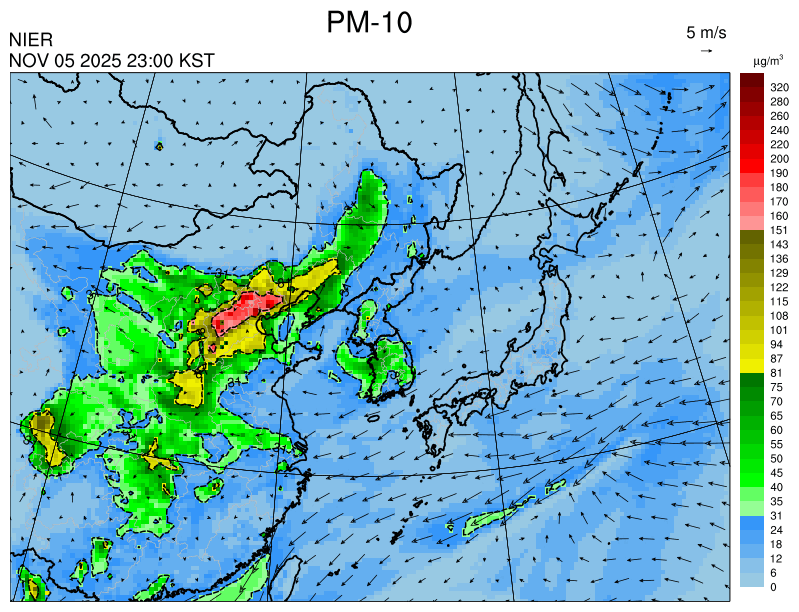 ○ [미세먼지] 대부분 중서부 지역은 대기 정체로 전일 잔류 미세먼지가 유지되는 가운데 밤에 연직(상·하층) 혼합이 약해 국내 발생 미세먼지가 축적되어 농도가 높을 것으로 예상됩니다.