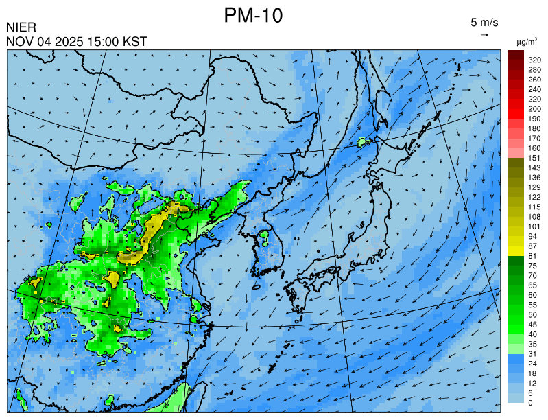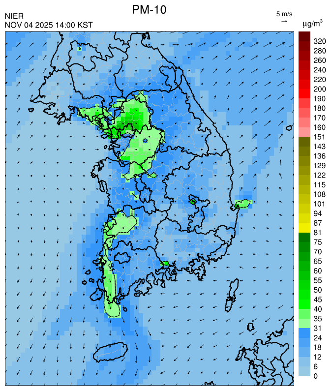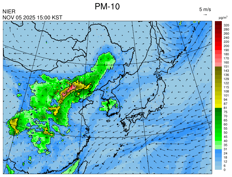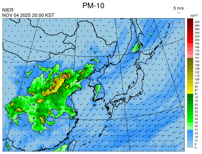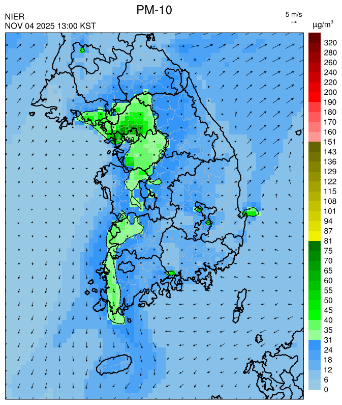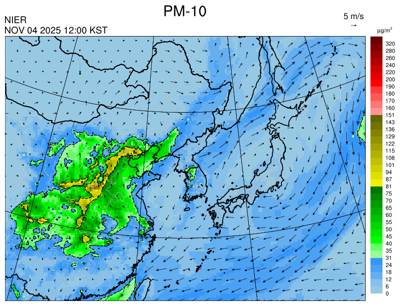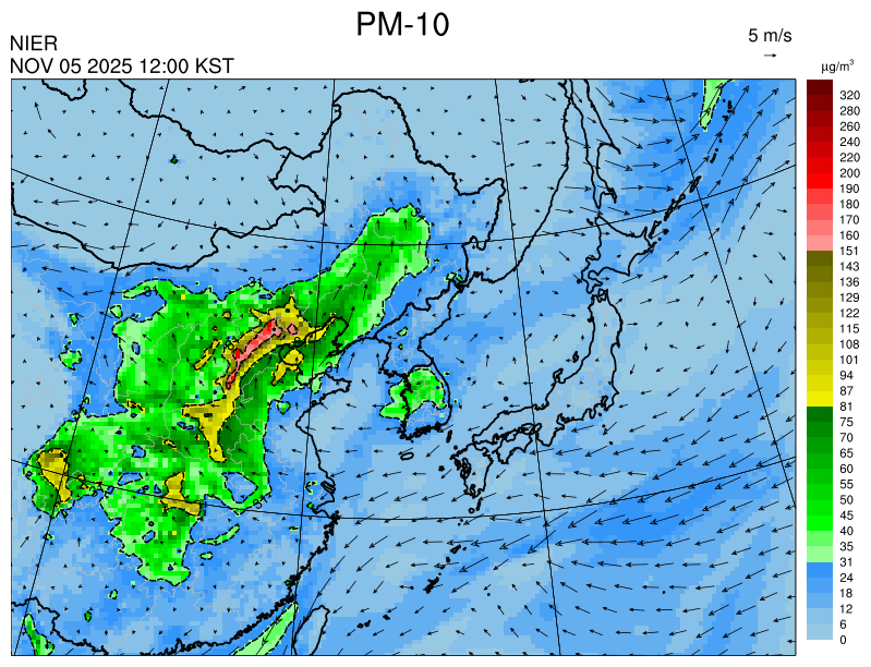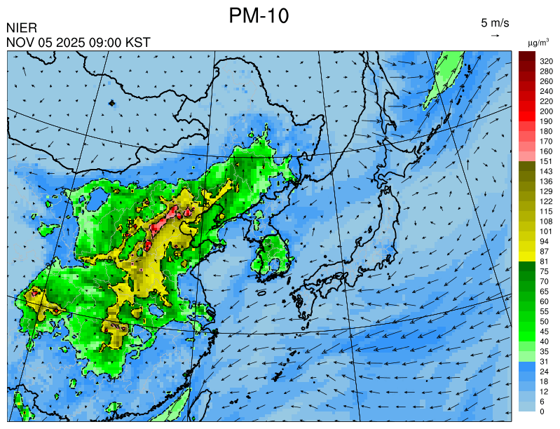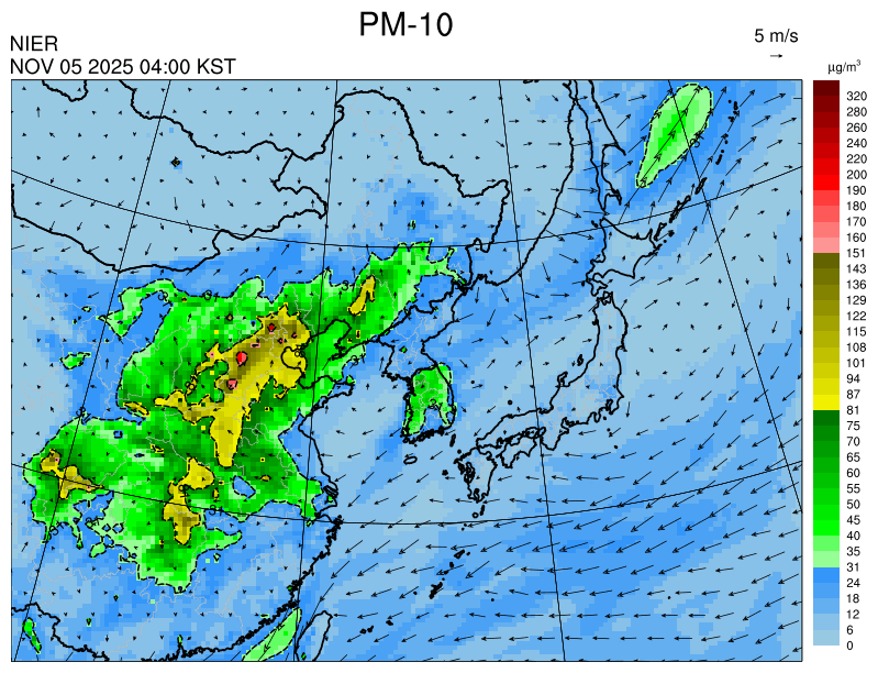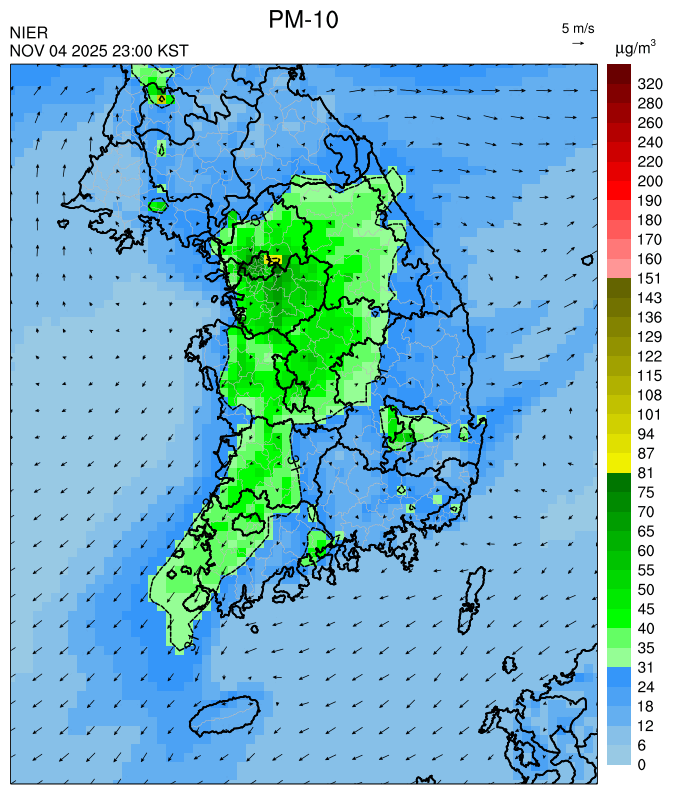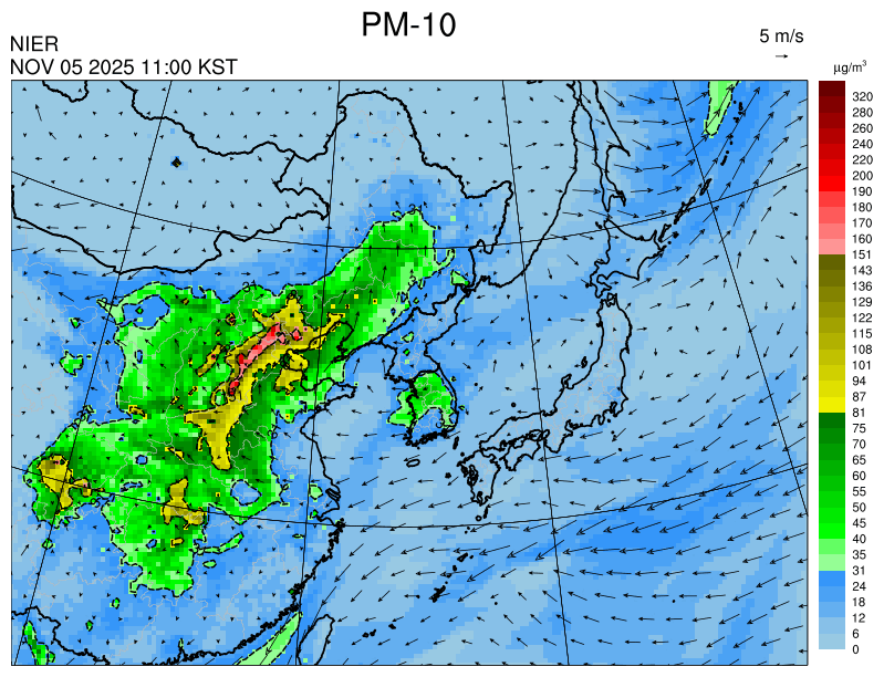 ○ [미세먼지] 대부분 중서부 지역은 대기 정체로 전일 잔류 미세먼지가 유지되는 가운데 밤에 연직(상·하층) 혼합이 약해 국내 발생 미세먼지가 축적되어 농도가 높을 것으로 예상됩니다.