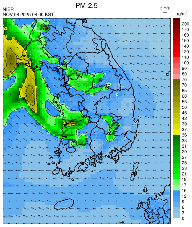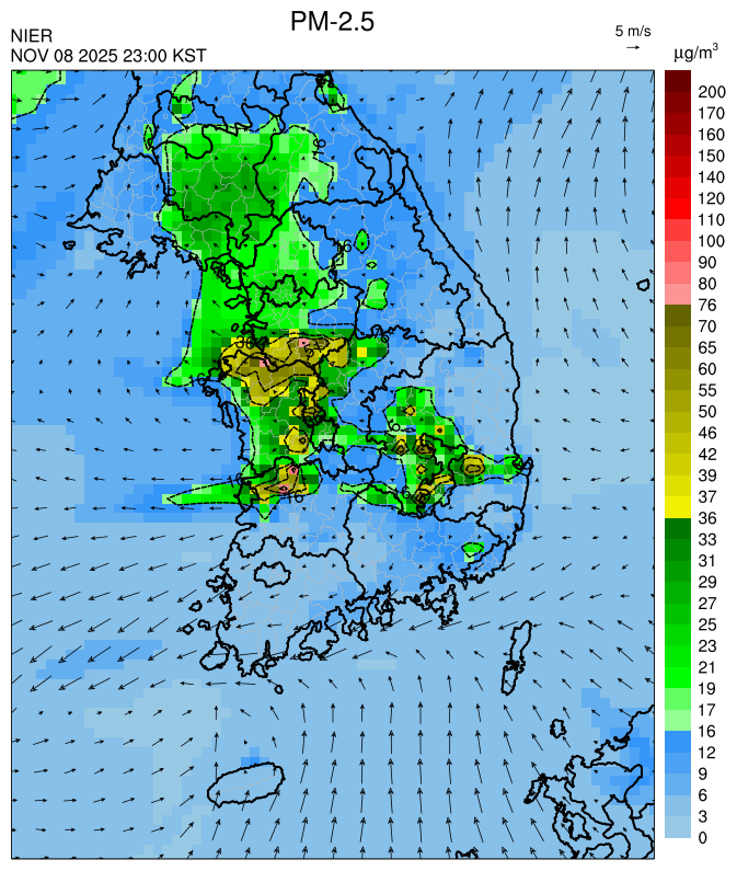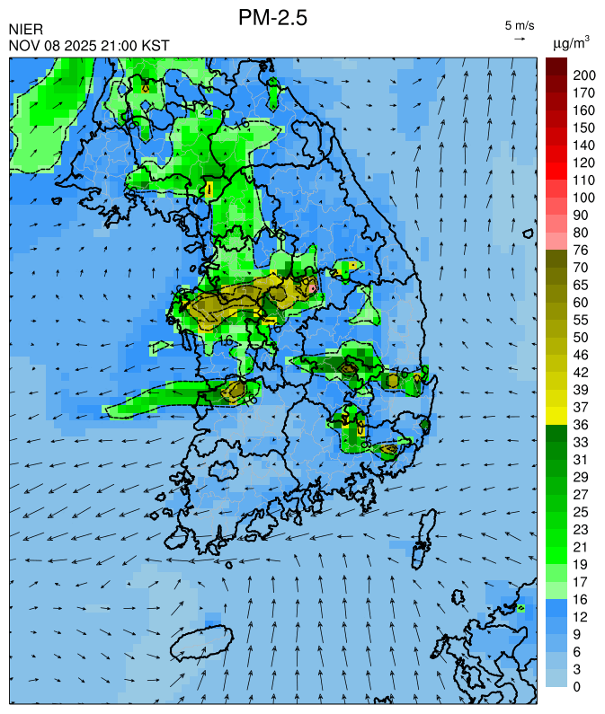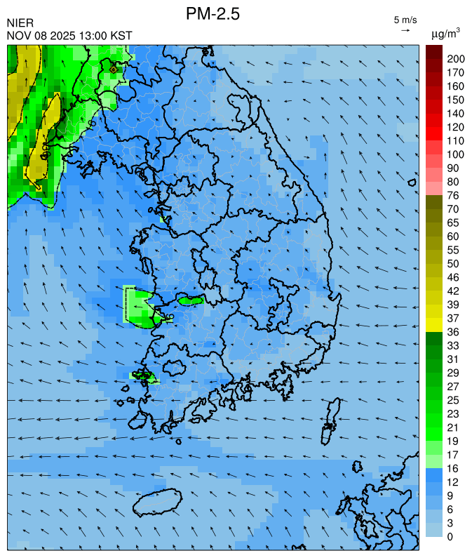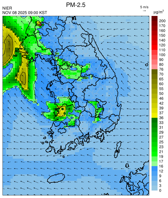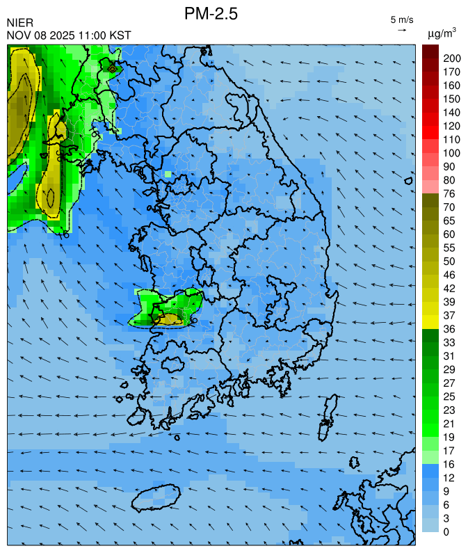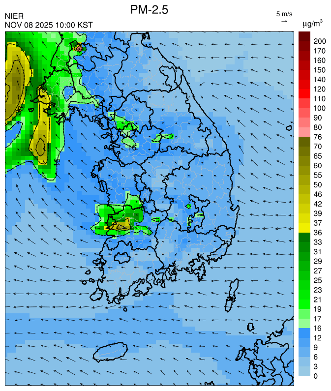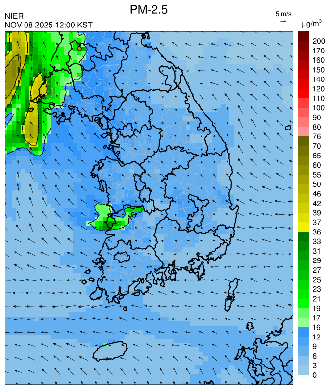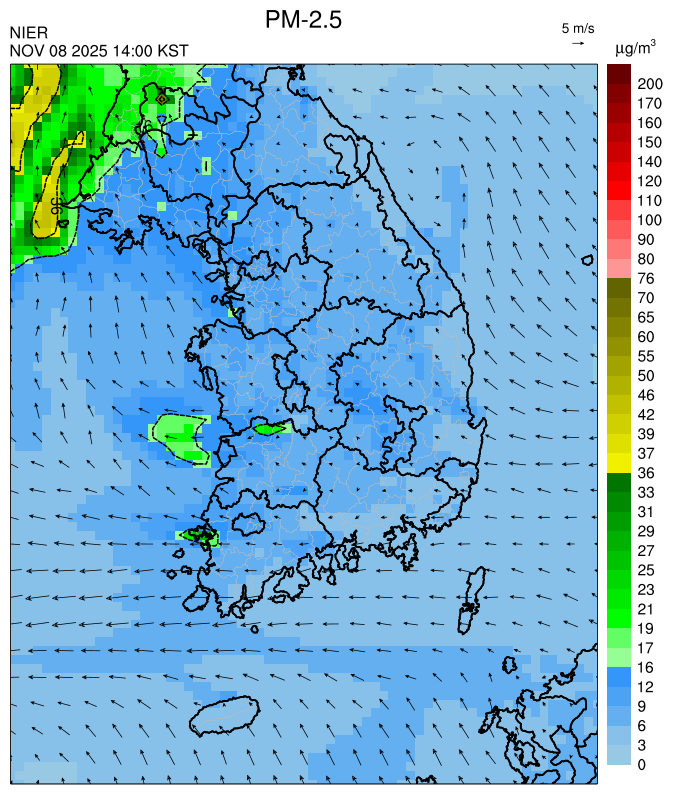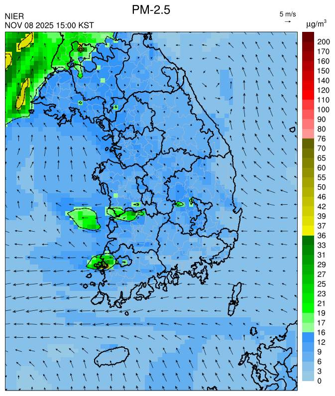 [11월 9일~12일] (9~11일) 원활한 대기 확산과 강수(9일)의 영향으로 전 권역에서 초미세먼지 농도가 '낮음' 수준일 것으로 예상됩니다. (12일) 국외 미세먼지가 유입되고 대기 정체로 국내 미세먼지가 축적되어 서울·인천 지역에서 '높음' 수준일 것으로 예상됩니다.