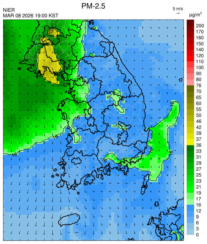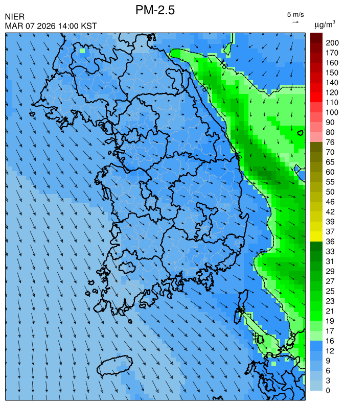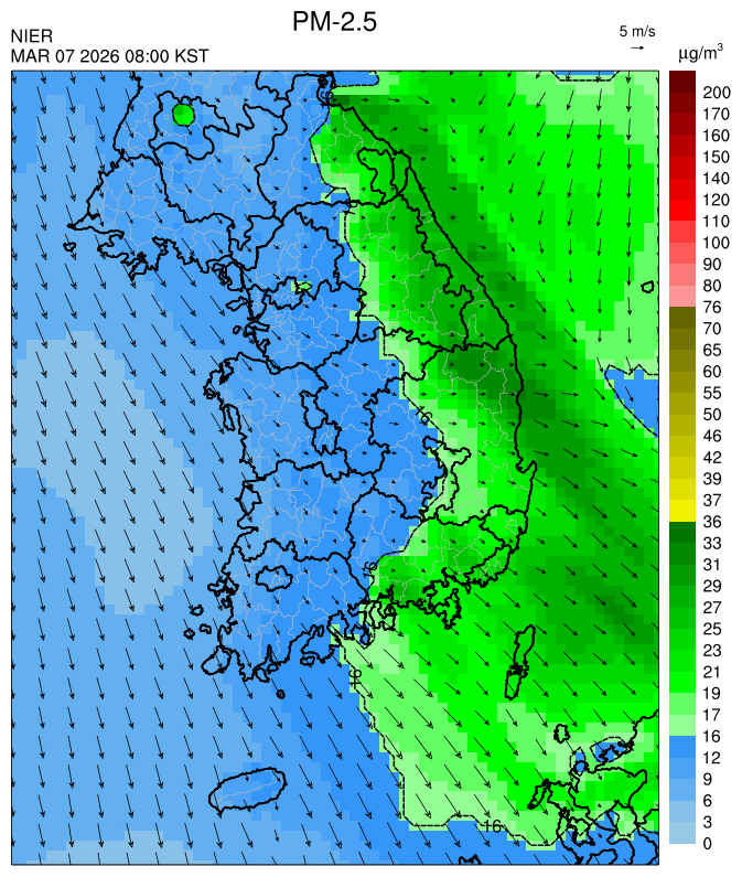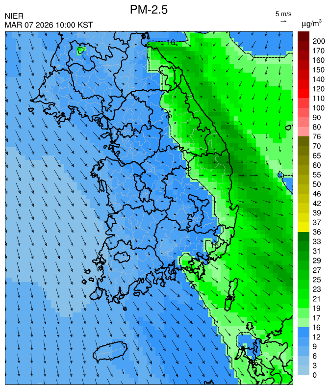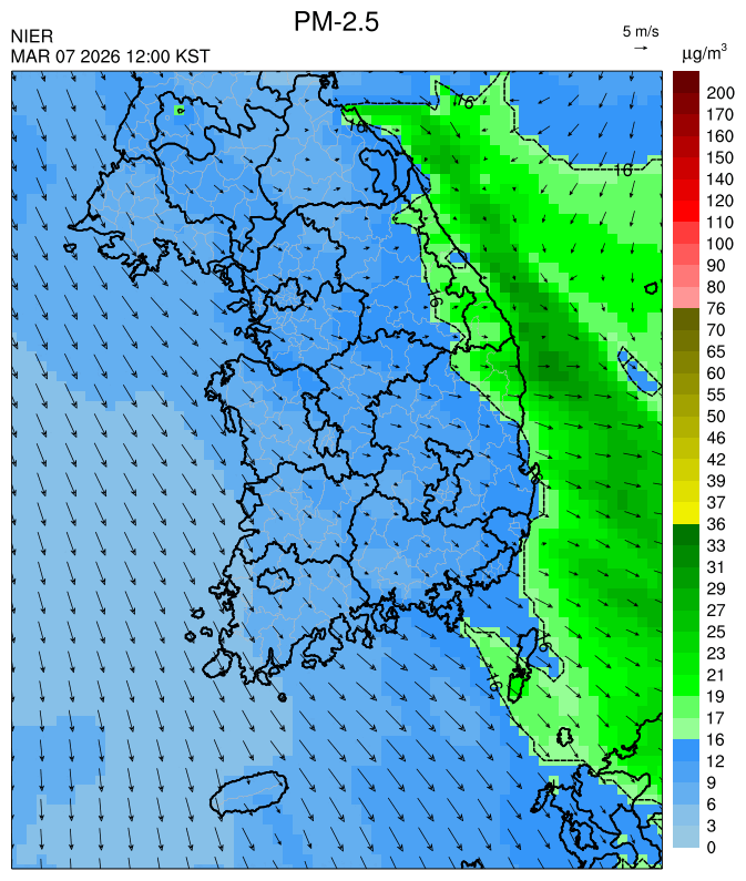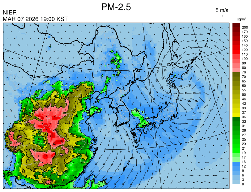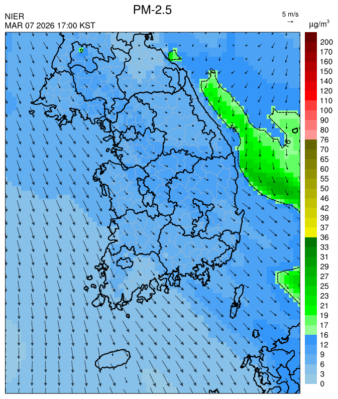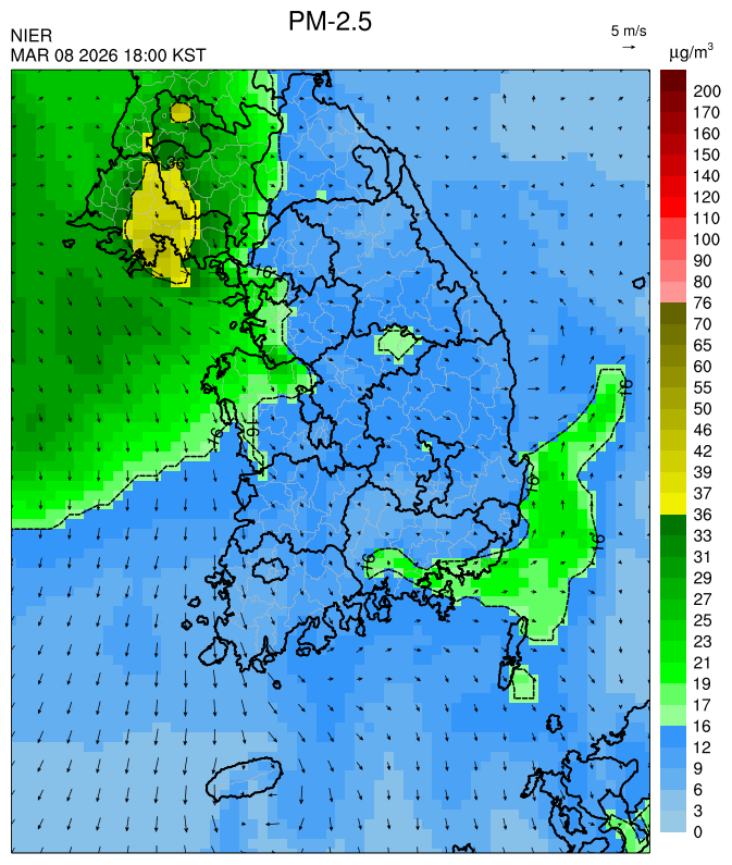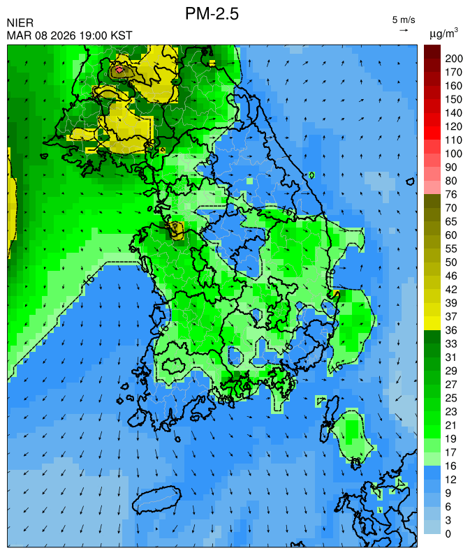 ○ 청정한 북서 기류가 유입되어 서쪽 지역부터 점차 '좋음'으로 회복되겠으나, 일부 중부 지역과 대부분 남동부 지역은 전일 잔류 미세먼지 영향으로 일평균 농도가 '보통'으로 예상됩니다.
