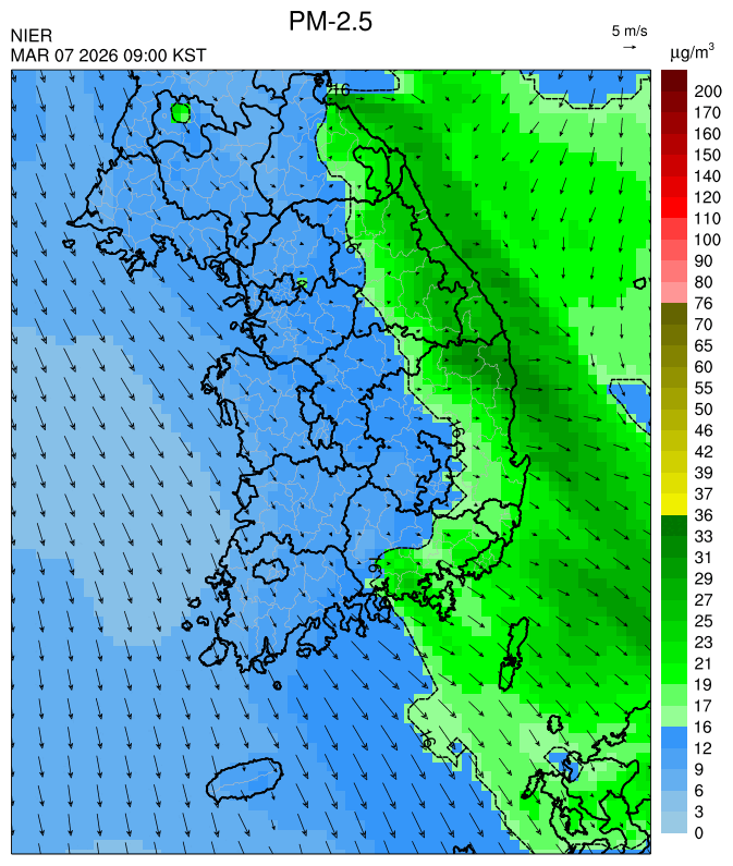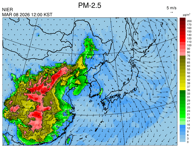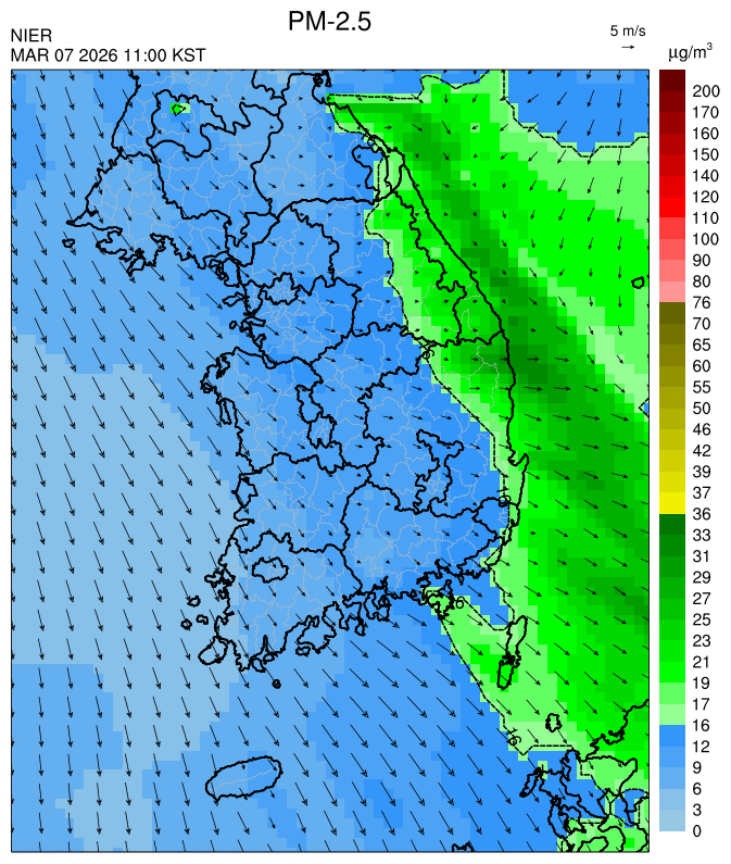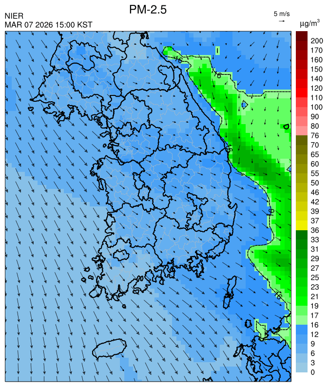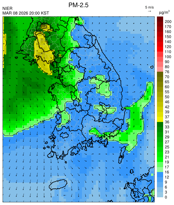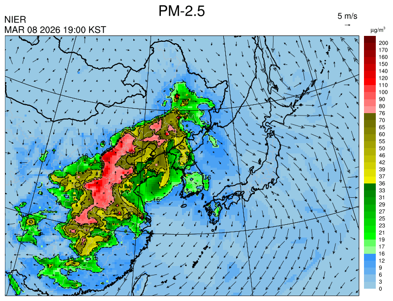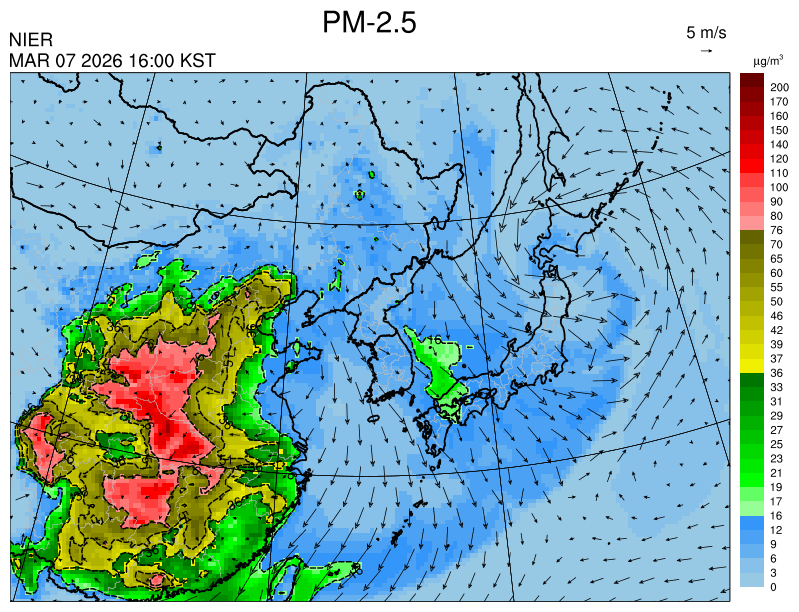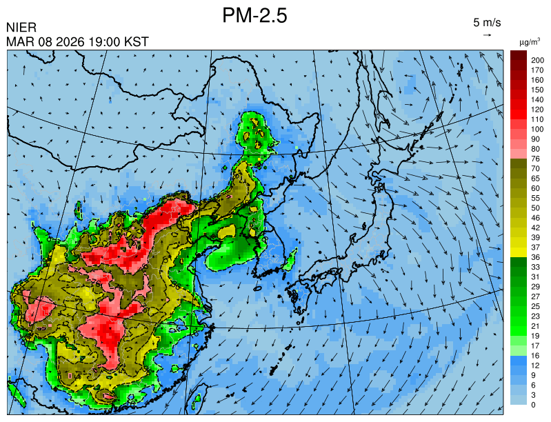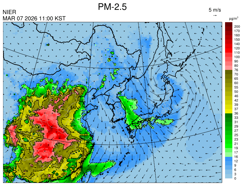 ○ 청정한 북서 기류가 유입되어 서쪽 지역부터 점차 '좋음'으로 회복되겠으나, 일부 중부 지역과 대부분 남동부 지역은 전일 잔류 미세먼지 영향으로 일평균 농도가 '보통'으로 예상됩니다.
