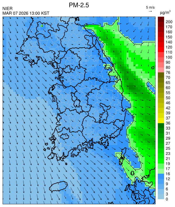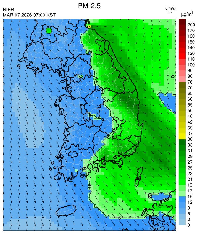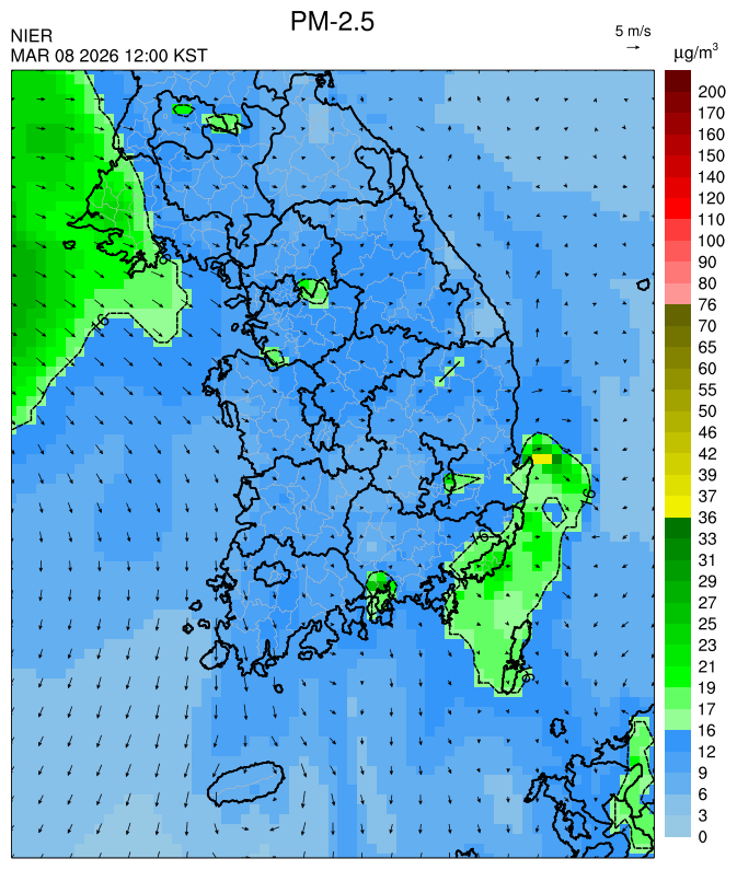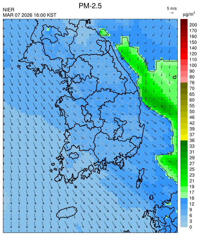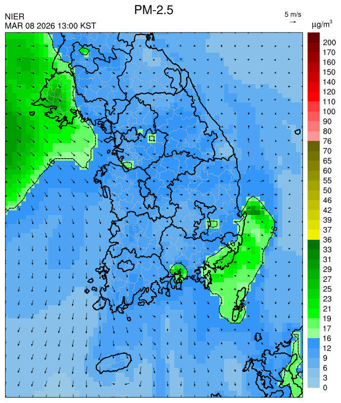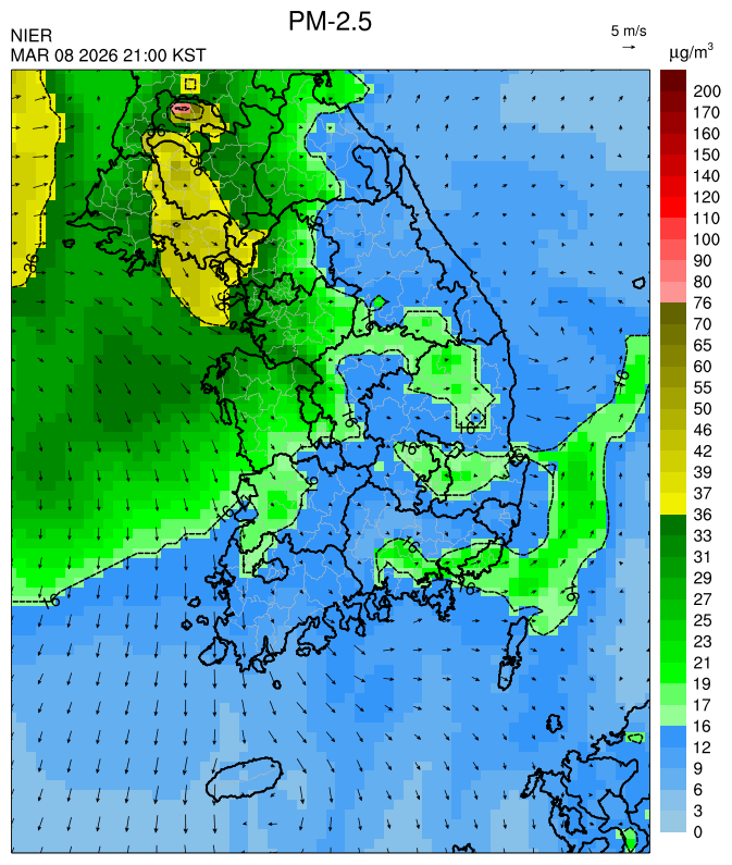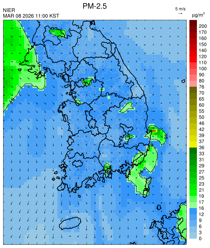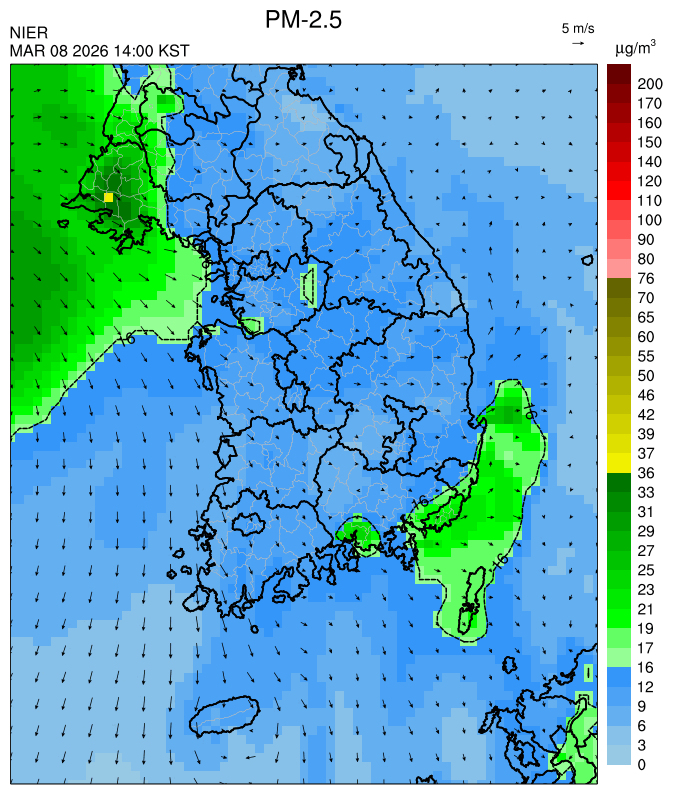 ○ 청정한 북서 기류가 유입되어 서쪽 지역부터 점차 '좋음'으로 회복되겠으나, 일부 중부 지역과 대부분 남동부 지역은 전일 잔류 미세먼지 영향으로 일평균 농도가 '보통'으로 예상됩니다.