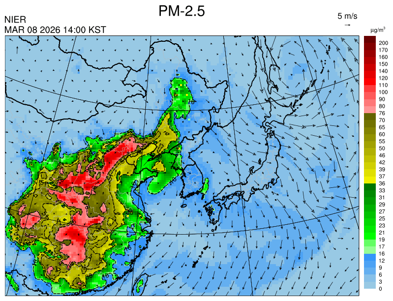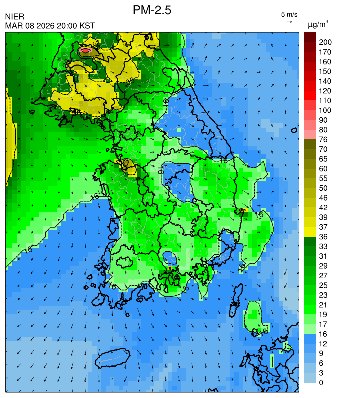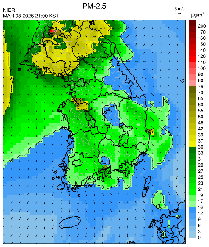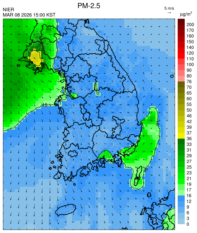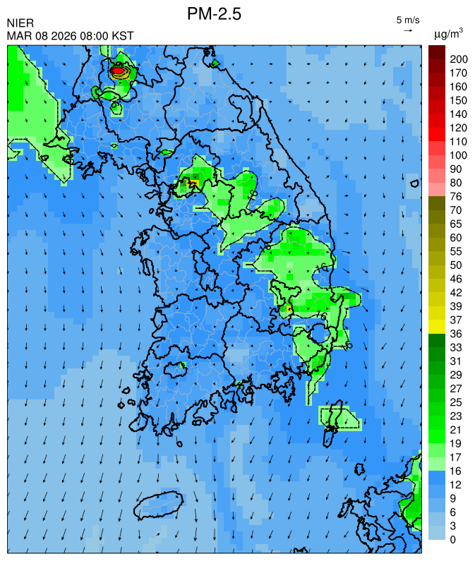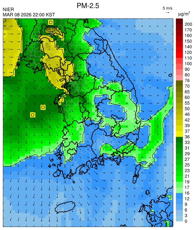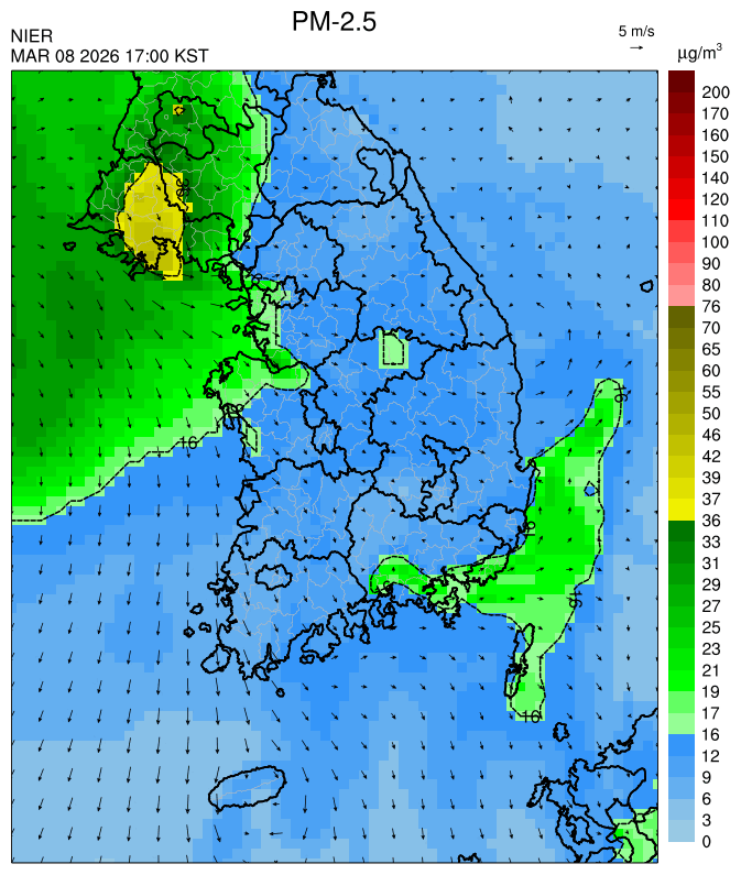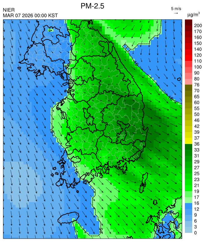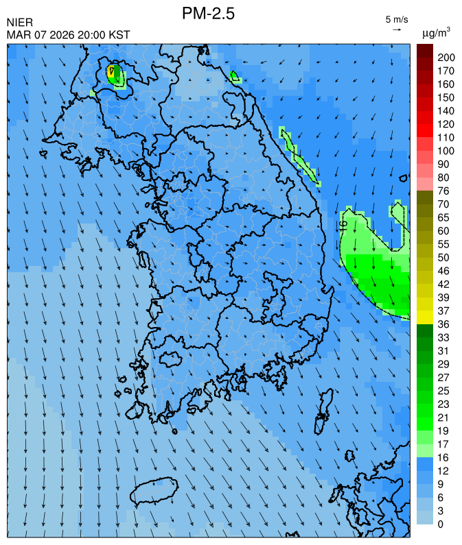 ○ 청정한 북서 기류가 유입되어 서쪽 지역부터 점차 '좋음'으로 회복되겠으나, 일부 중부 지역과 대부분 남동부 지역은 전일 잔류 미세먼지 영향으로 일평균 농도가 '보통'으로 예상됩니다.