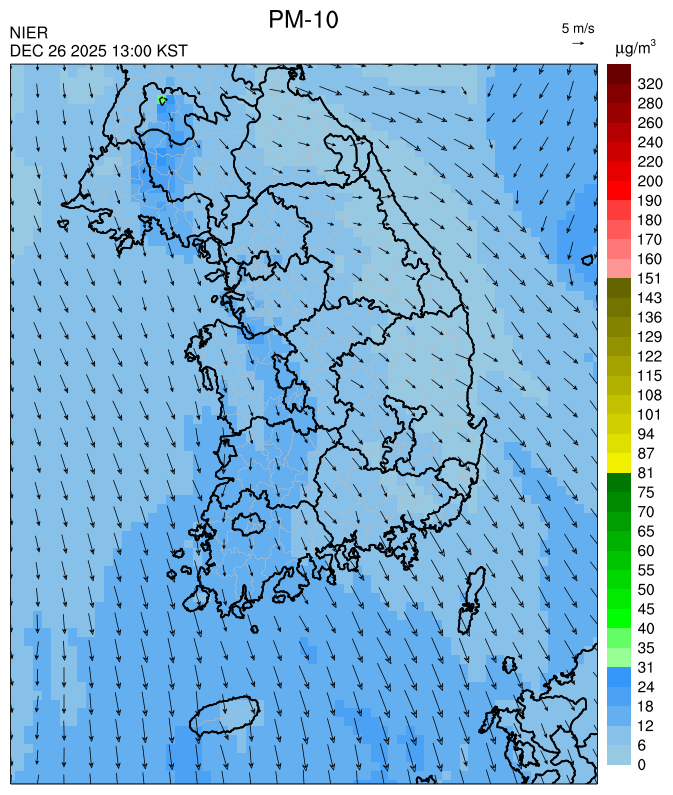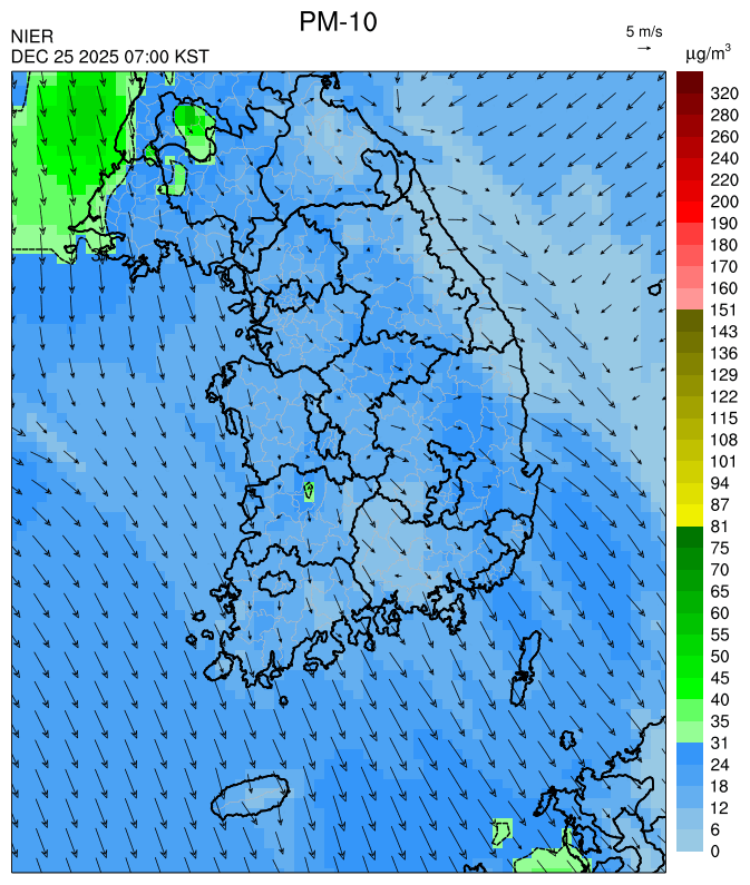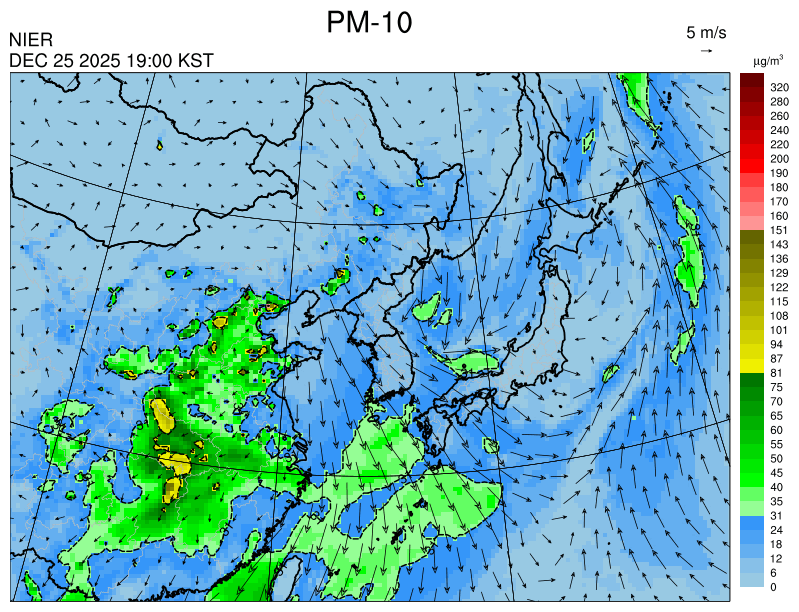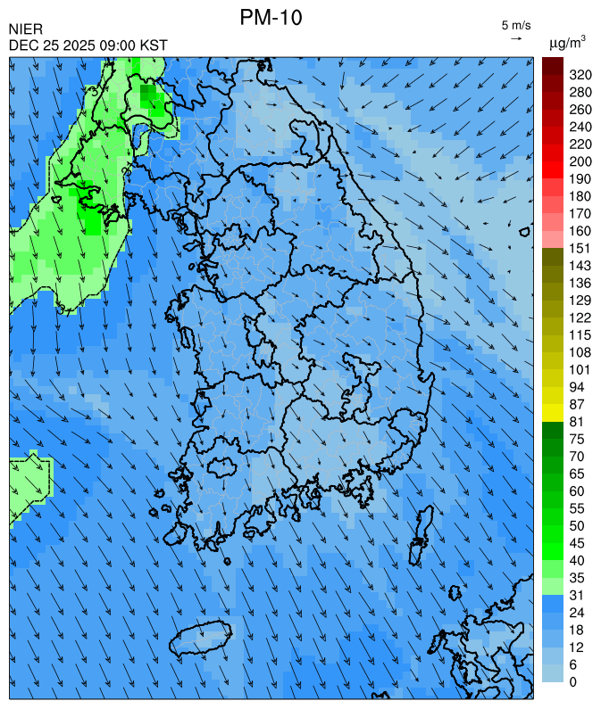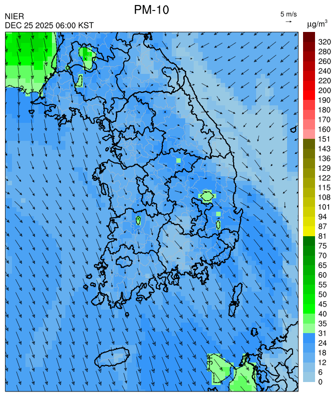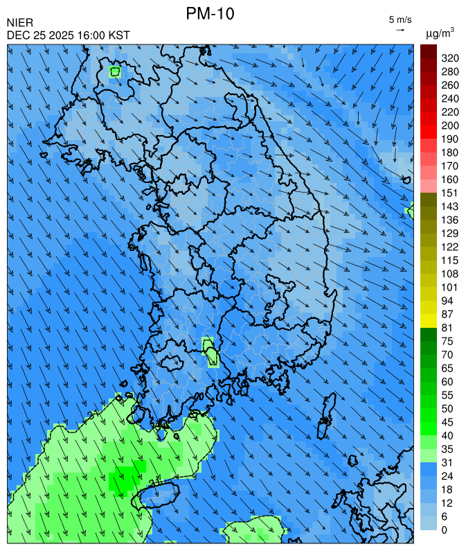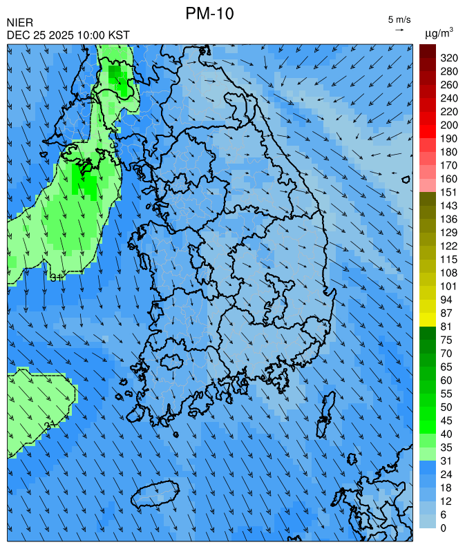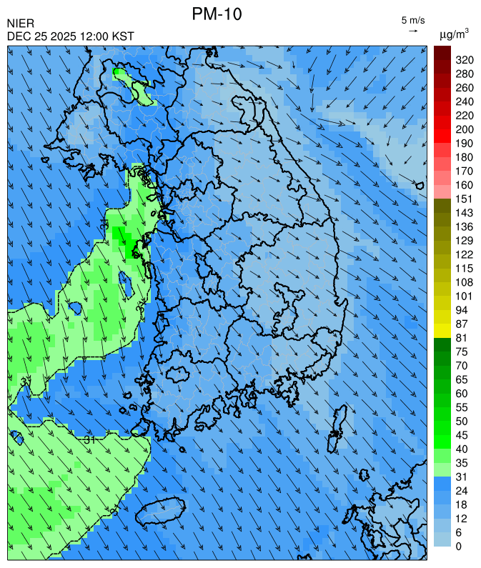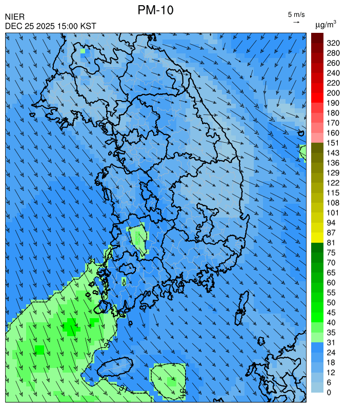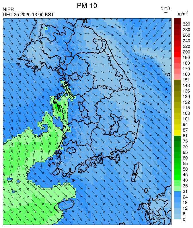 ○ 청정한 북서 기류의 유입과 낮동안 원활한 연직(상·하층) 확산으로 전 지역에서 미세먼지 농도는 일평균 '좋음'으로 예상됩니다.